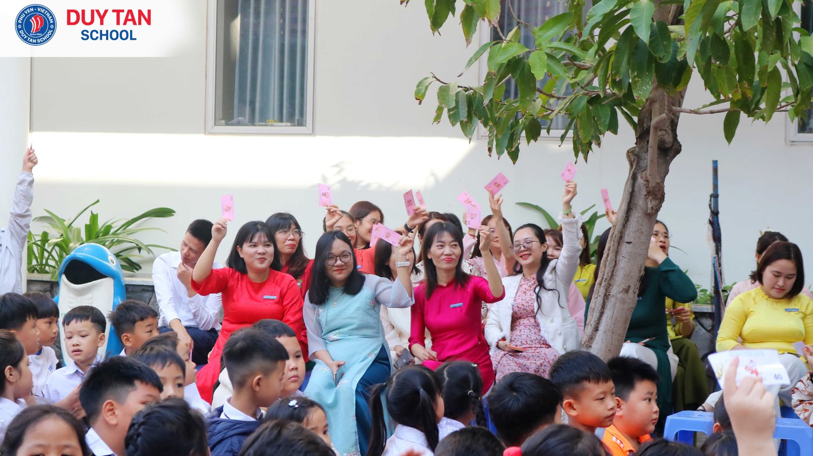 Trong khi đó, khối Tiểu học và THCS rộn ràng đón lộc xuân với trò chơi xổ số may mắn. Niềm vui ánh lên trong từng ánh mắt, nụ cười khi các em háo hức chờ đợi và đón nhận những phần quà đầu năm đầy ý nghĩa.
