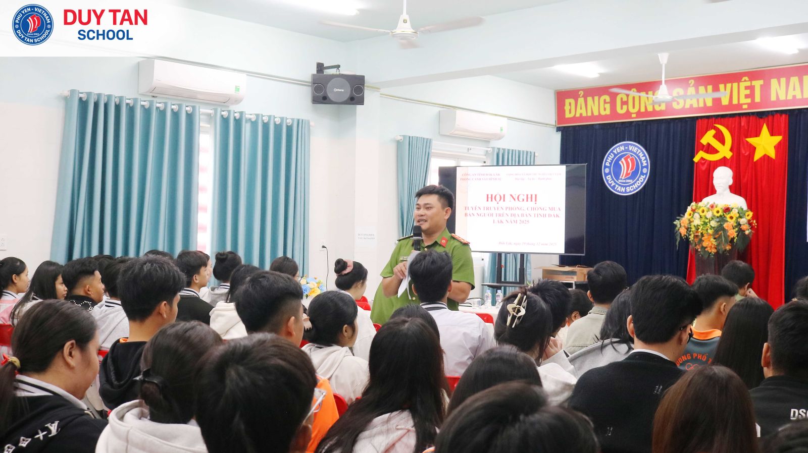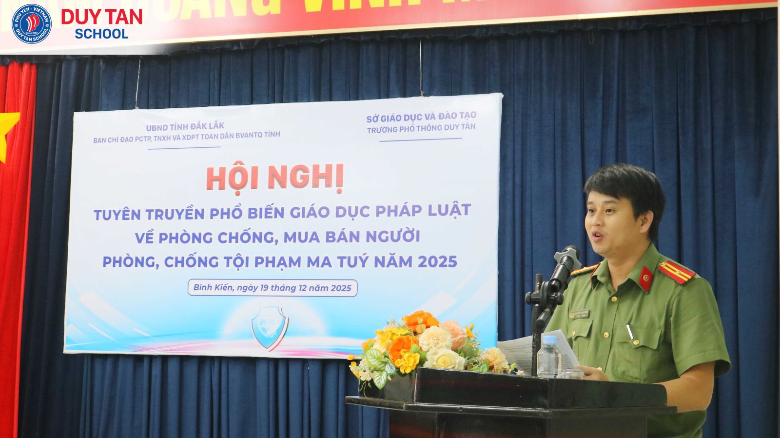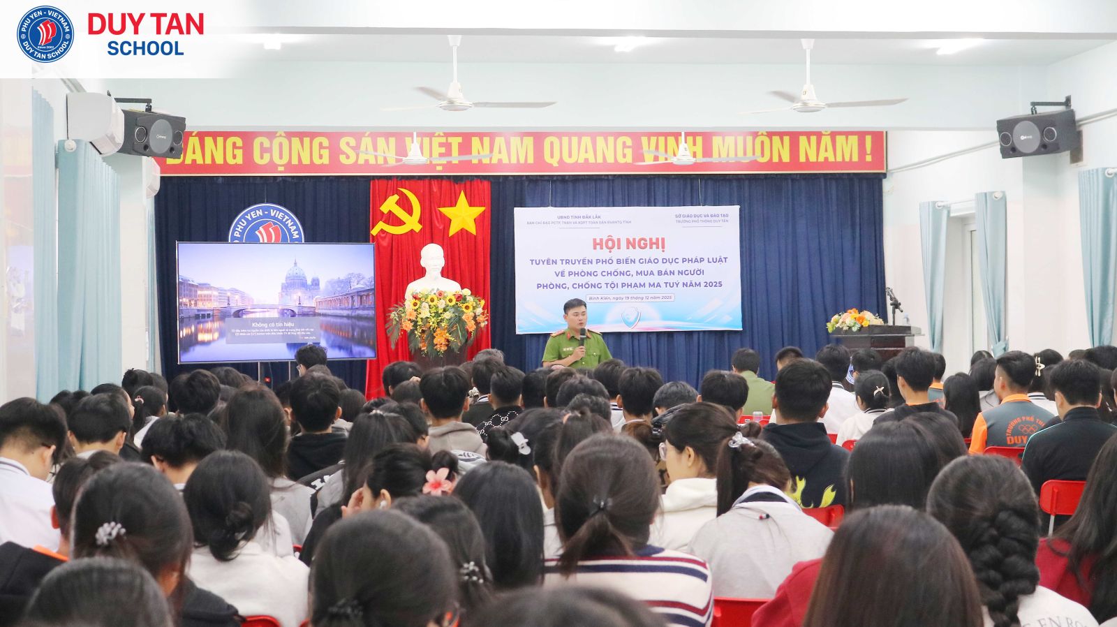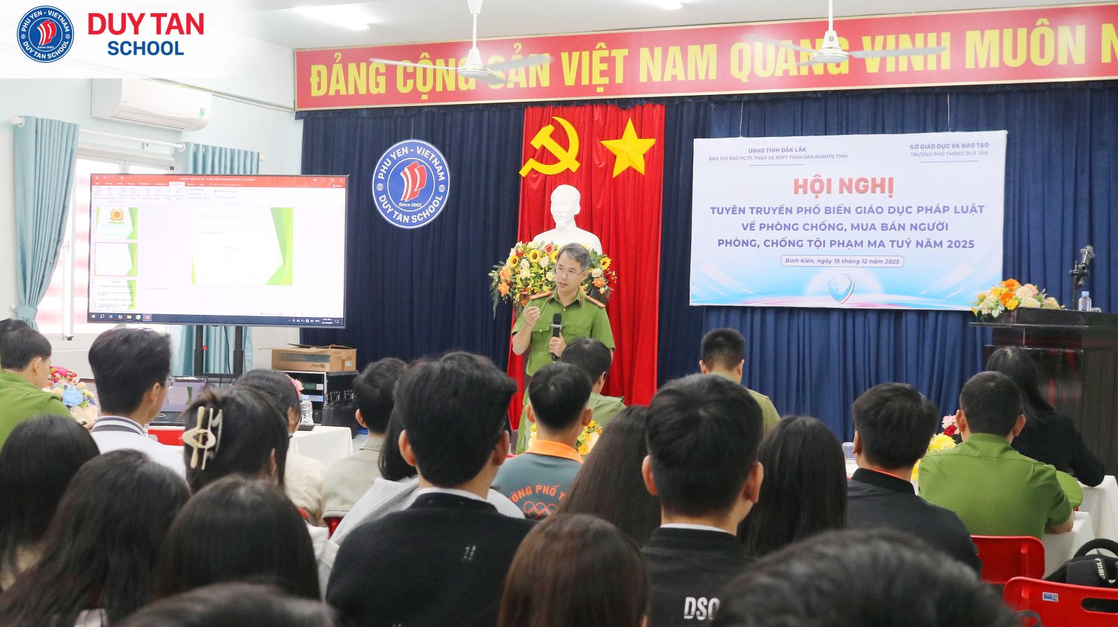 Sáng ngày 19/12/2025, Ban Chỉ đạo phòng, chống tội phạm, tệ nạn xã hội và xây dựng phong trào Toàn dân bảo vệ an ninh Tổ quốc tỉnh Đắk Lắk đã phối hợp với Trường Phổ thông Duy Tân tổ chức buổi tuyên truyền, phổ biến kiến thức về phòng, chống mua bán người và phòng, chống ma túy năm 2025 cho toàn thể học sinh cấp THPT của nhà trường.