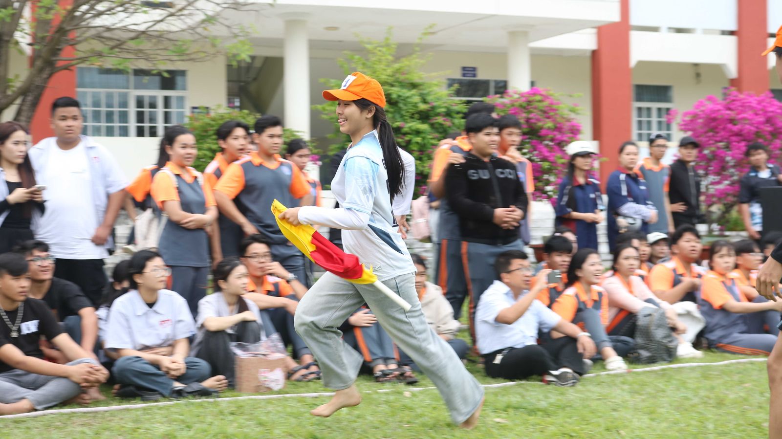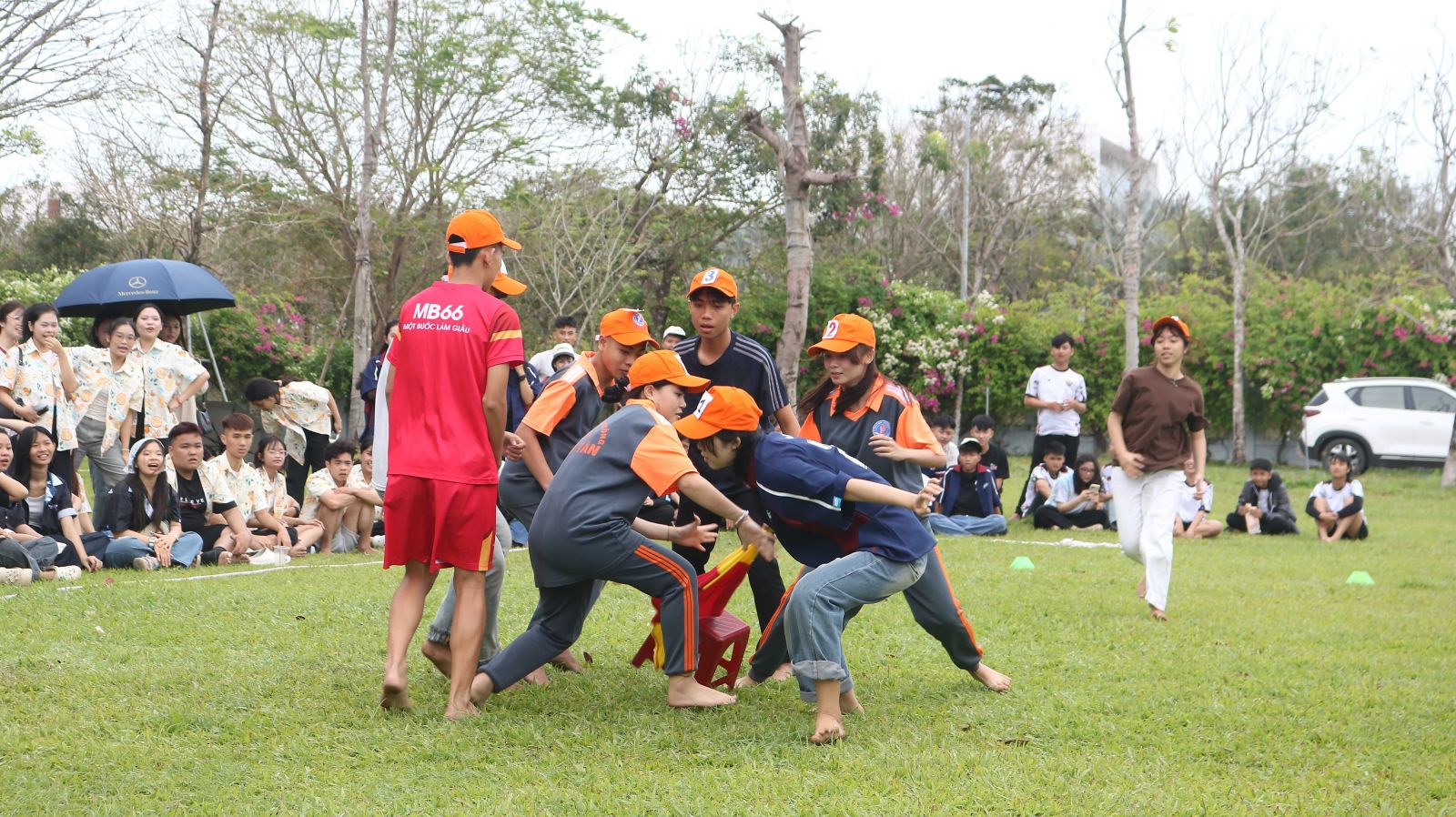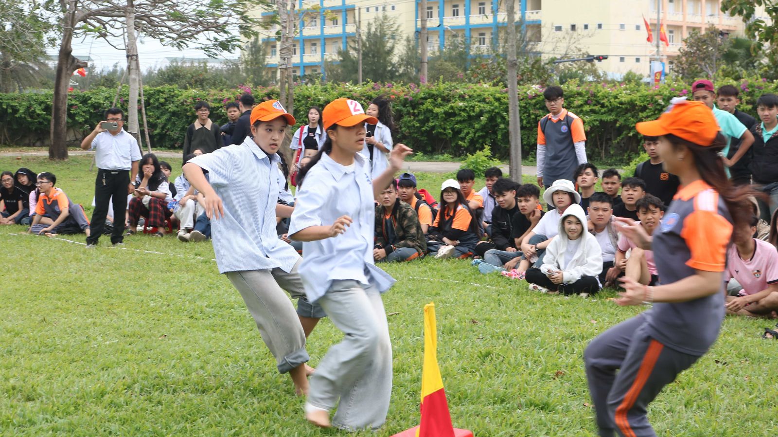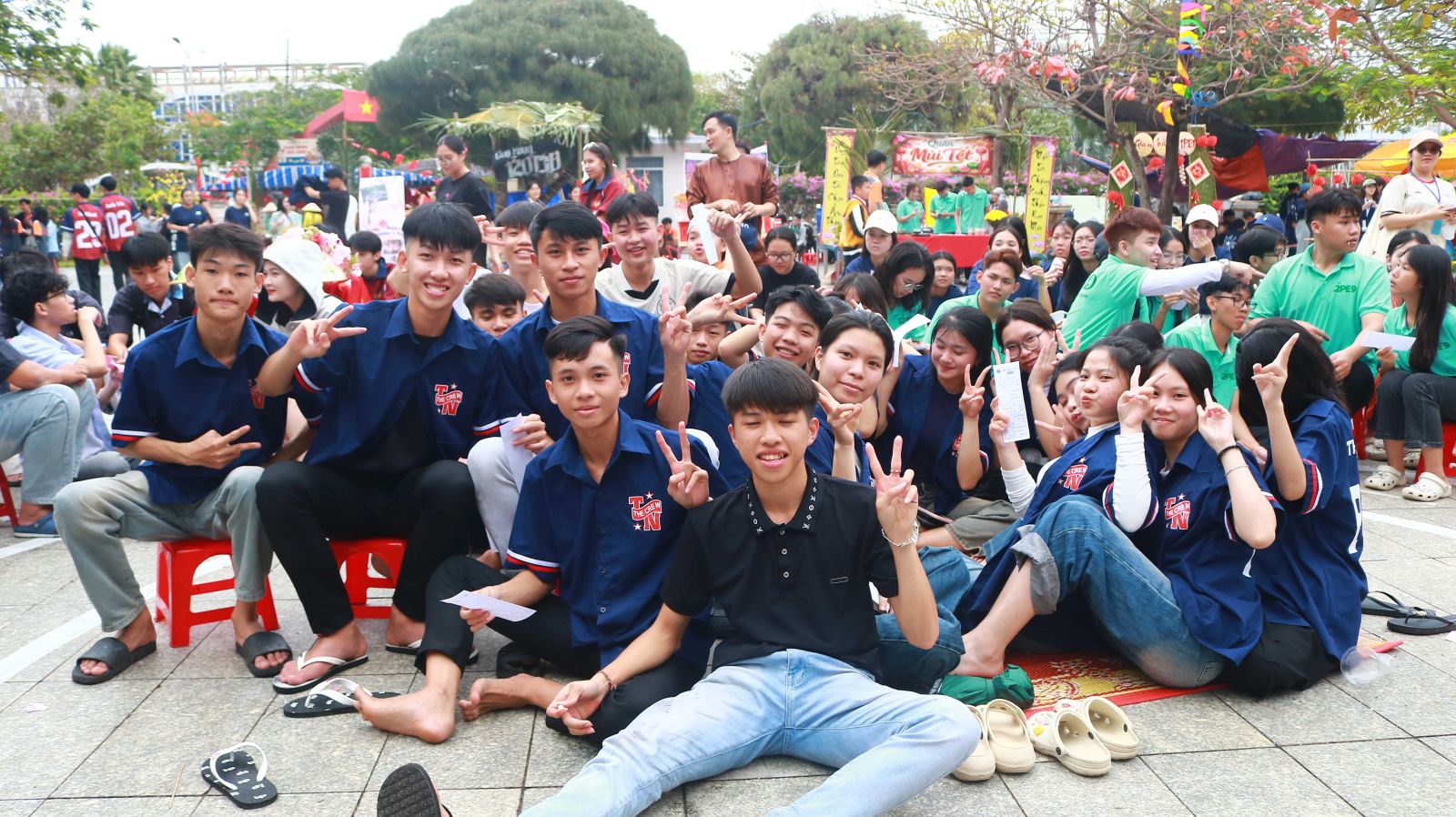 Không chỉ có ẩm thực, sân trường còn náo nức tiếng cười với các trò chơi dân gian quen thuộc: nhảy sạp trong tiếng la hét mỗi khi người chơi xém trật nhịp, cuộc thi nhảy “thụng” khiến ai nấy cười nghiêng ngả; rồi kéo co, ném lon… Tất cả càng thêm rộn ràng, nhất là trong điệu hò zô lô tô vui tai, khiến chân tay ai cũng muốn nhịp theo.