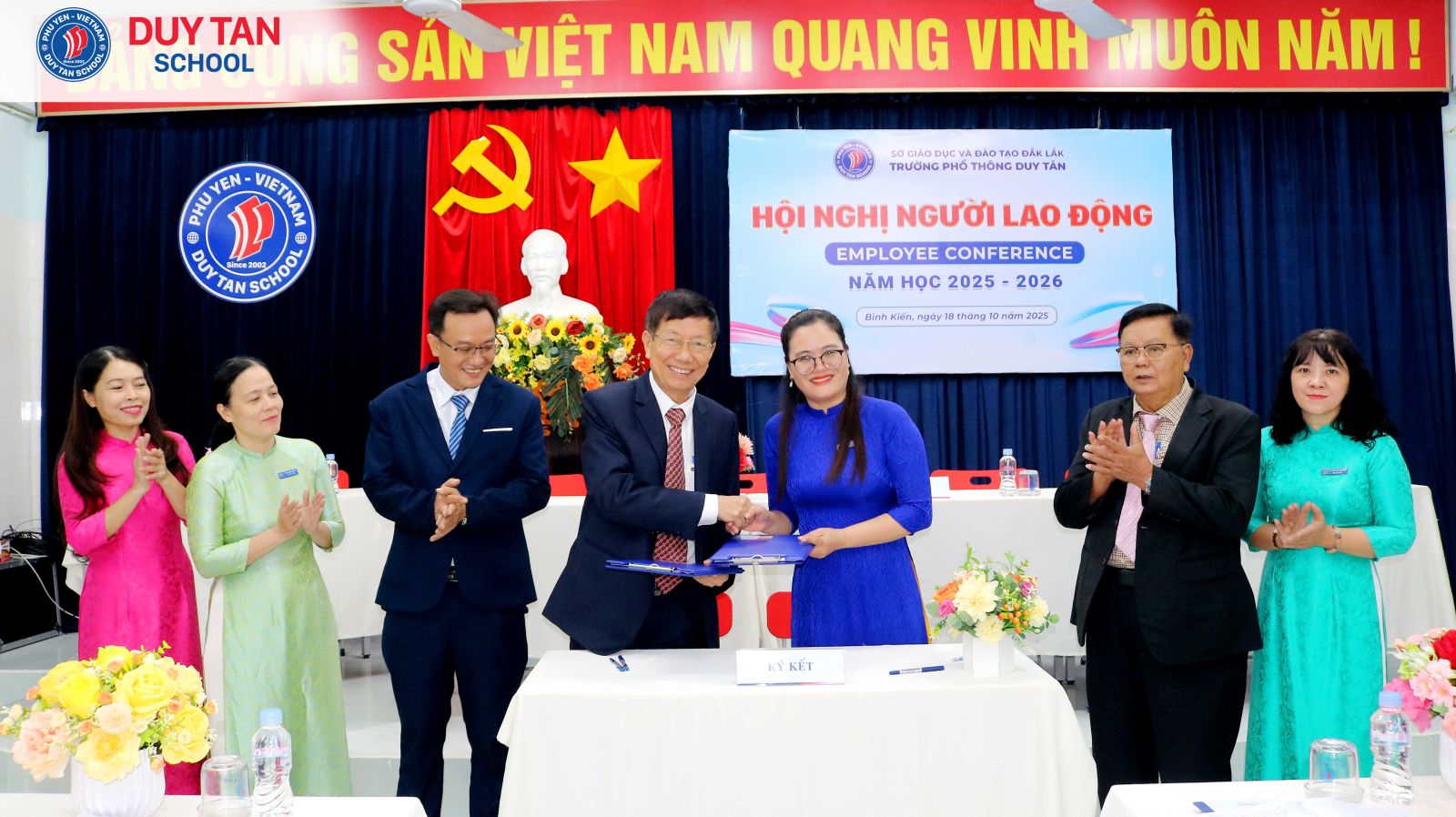 Trong không khí ấm áp và nhiệt huyết, phần ký kết giao ước thi đua giữa Ban Giám hiệu và Công đoàn cơ sở được tiến hành, thể hiện sự đồng lòng, quyết tâm của toàn thể tập thể Duy Tân và thống nhất thông qua các chỉ tiêu thực hiện nhiệm vụ năm học 2025 – 2026.