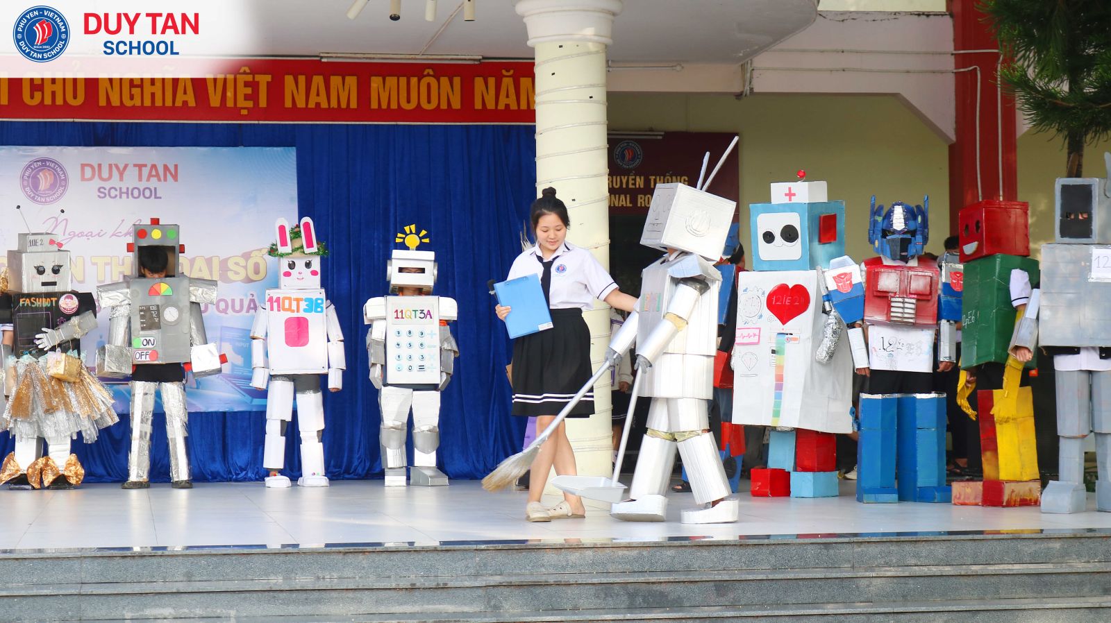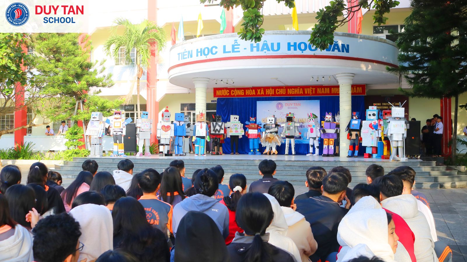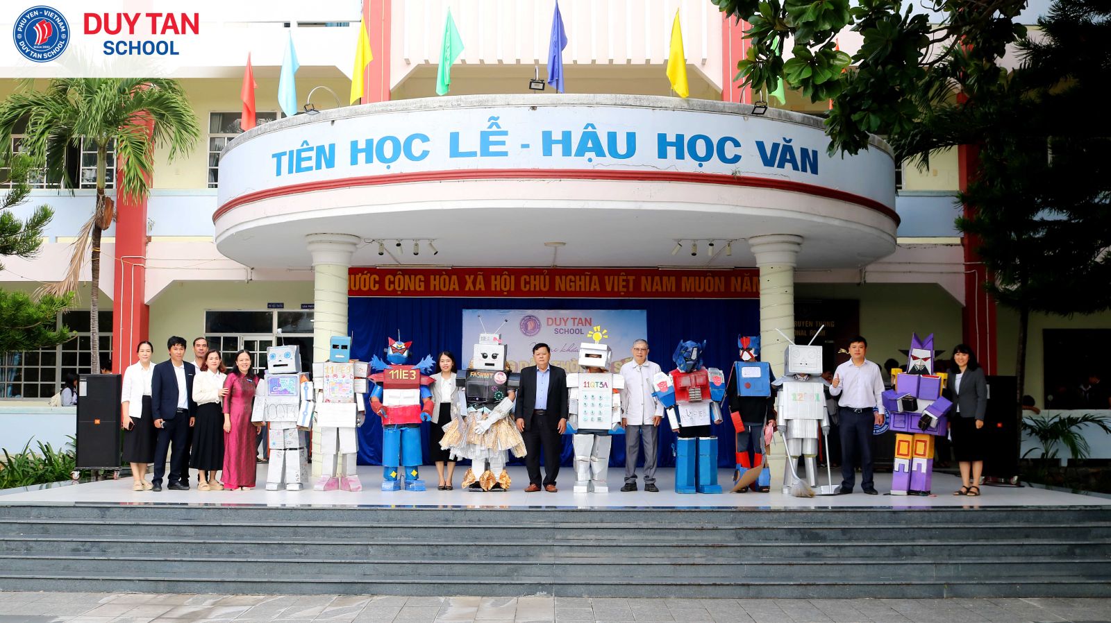 Một “bữa tiệc Robot” đầy màu sắc sáng tạo đã thực sự bùng nổ trong buổi ngoại khóa Công dân thời đại số tại Trường Phổ thông Duy Tân. Từ những vật liệu quen thuộc, mỗi tập thể lớp đã tự tay chế tạo robot mang đậm dấu ấn riêng, gắn liền với các ứng dụng thiết thực trong đời sống như: robot giao hàng nhanh, robot hỗ trợ học tập, rèn kỹ năng giao tiếp, robot giải trí qua các điệu nhảy và tạo hình sáng tạo.