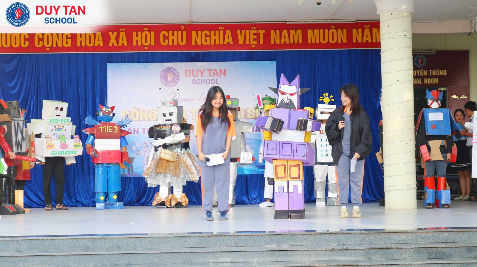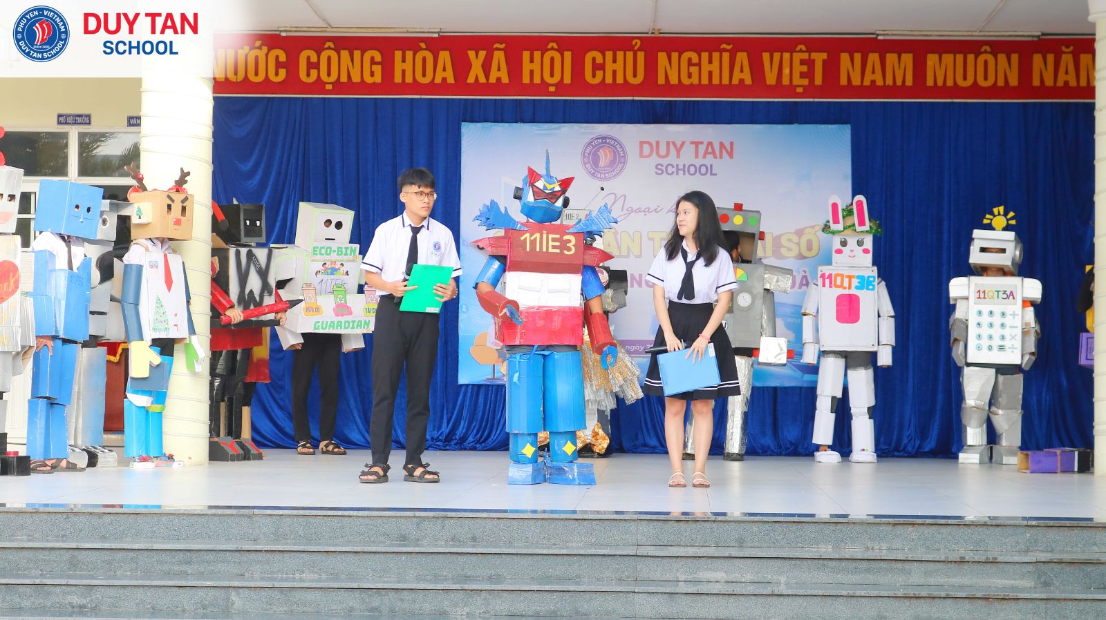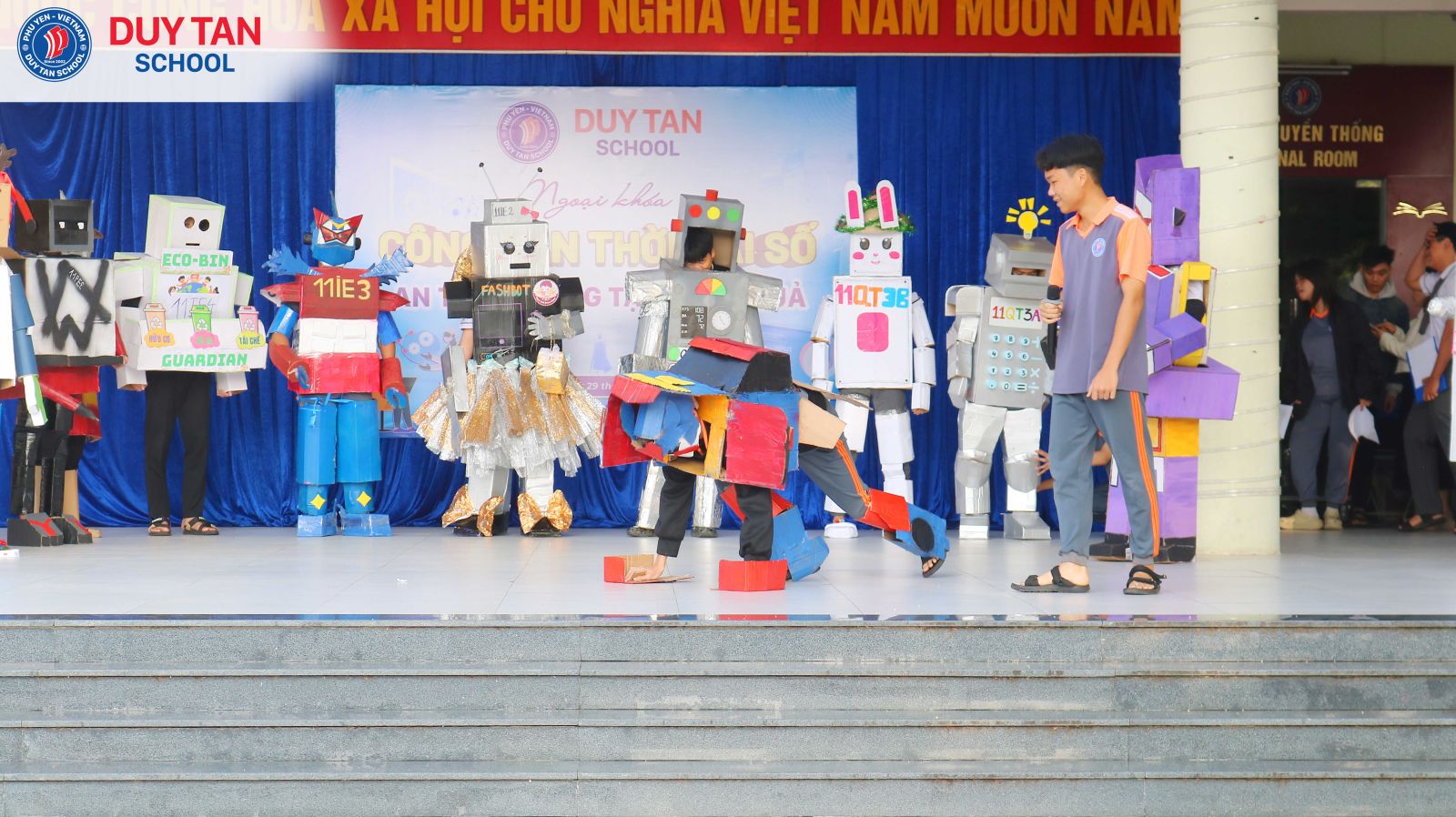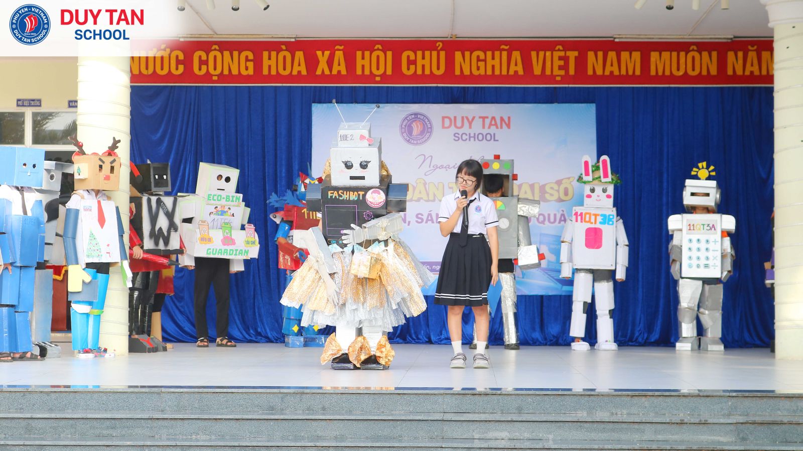 Một “bữa tiệc Robot” đầy màu sắc sáng tạo đã thực sự bùng nổ trong buổi ngoại khóa Công dân thời đại số tại Trường Phổ thông Duy Tân. Từ những vật liệu quen thuộc, mỗi tập thể lớp đã tự tay chế tạo robot mang đậm dấu ấn riêng, gắn liền với các ứng dụng thiết thực trong đời sống như: robot giao hàng nhanh, robot hỗ trợ học tập, rèn kỹ năng giao tiếp, robot giải trí qua các điệu nhảy và tạo hình sáng tạo.