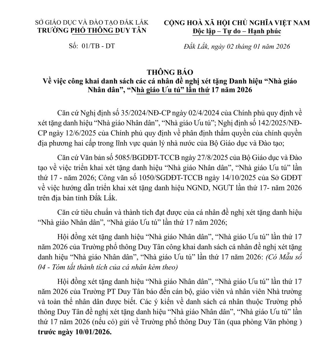 THÔNG BÁO CÔNG KHAI DANH SÁCH CÁ NHÂN ĐỀ NGHỊ XÉT TẶNG DANH HIỆU NHÀ GIÁO NHÂN DÂN, NHÀ GIÁO ƯU TÚ LẦN THỨ 17 NĂM 2026