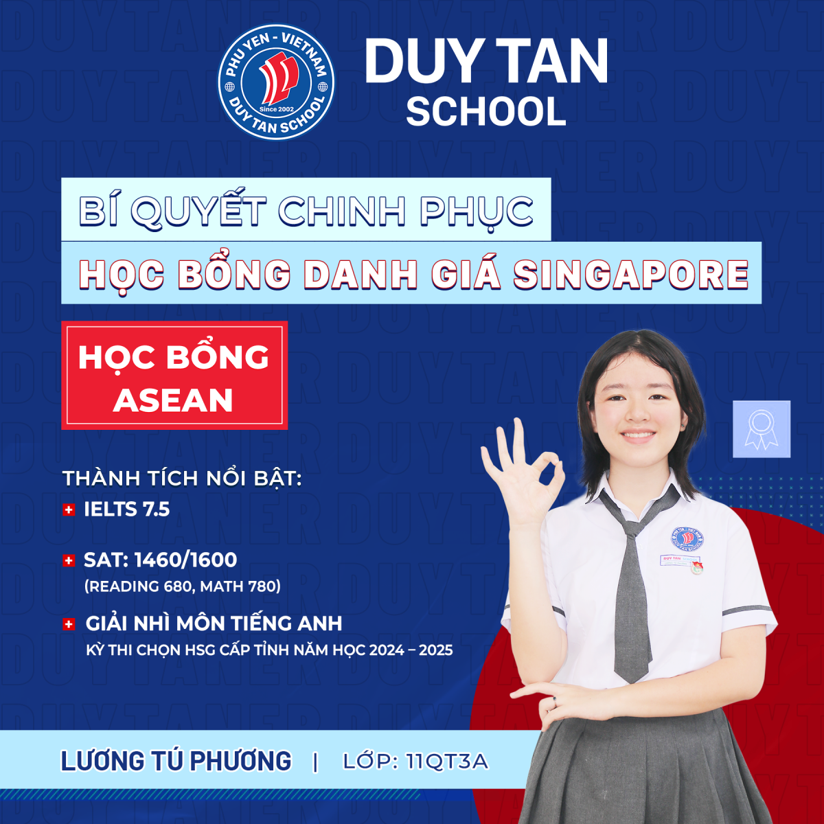 Trải qua quá trình chuẩn bị hồ sơ công phu và vượt qua nhiều vòng tuyển chọn khắt khe, em Lương Tú Phương, học sinh lớp 11QT3A, Trường Phổ thông Duy Tân, đã xuất sắc giành được Học bổng ASEAN Singapore. Suất học bổng này bao gồm 02 năm học THPT và 02 năm dự bị đại học theo hệ thống giáo dục Cambridge tại Singapore.