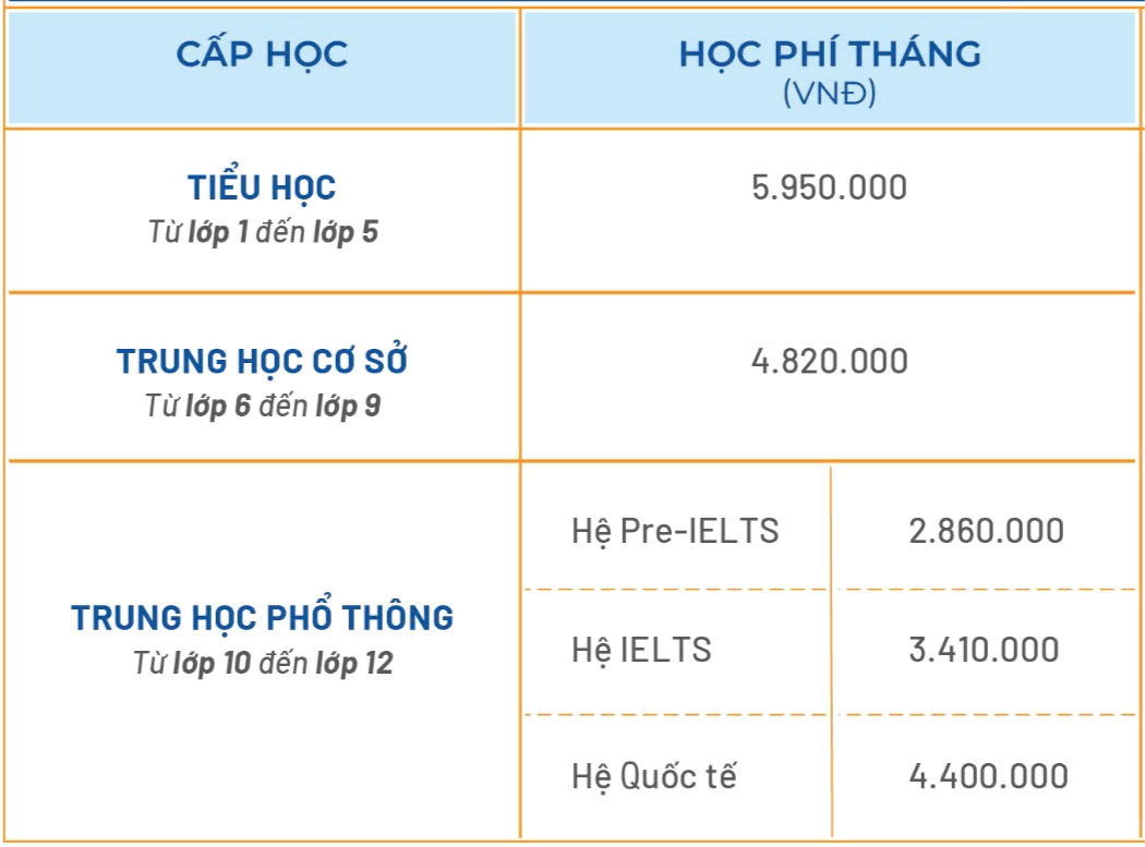 + Cấp THPT: chương trình IELTS hoặc chương trình tiếng Anh giao tiếp với giáo viên nước ngoài, chương trình tiếng Nhật, giáo dục kỹ năng sống, bơi lội và các chương trình văn - thể - mỹ khác.