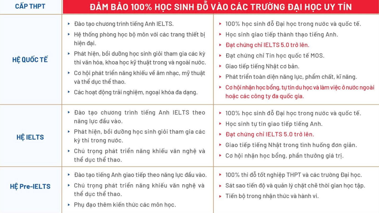 Bên cạnh đó, đối với hệ Quốc tế và hệ IELTS, học sinh được học theo giáo trình tiếng Anh IELTS với giáo viên bản ngữ. Nhà trường cũng tăng cường kiểm tra, đánh giá năng lực thông qua các bài thi thử IELTS. Từ đó, học sinh tự tin bước vào kỳ thi thật và đạt số điểm IELTS cao, nhận nhiều học bổng giá trị từ nhà trường và các đối tác liên kết, tự tin nộp hồ sơ du học tại các quốc gia.